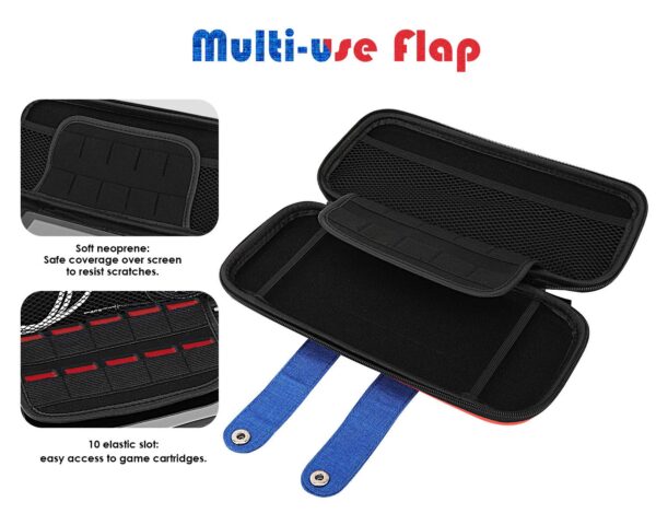 • Keep Switch in Place: Two elastic straps effectively fasten the switch console in the switch OLED case to avoid accidental falling out. In addition to holding up to 10 game cartridges, the built-in padded flap protects the console screen from scratches.